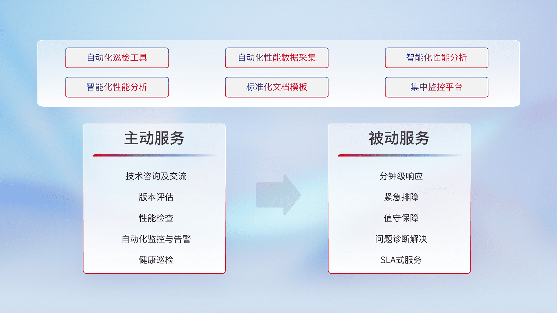 智能化工具和标准化文档,,,,保障服务质量,,,提供主动服务(包含技术咨询、、、版本评估、、性能检查、、、自动化监控与告警、、、健康巡检)和被动服务包含(分钟级响应、、、紧急排障、、、值守保障、、、问题诊断解决、、、、SLA服务)。。。。
